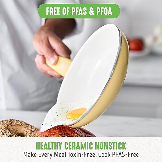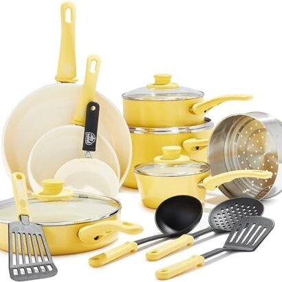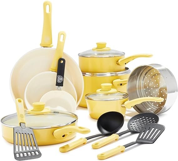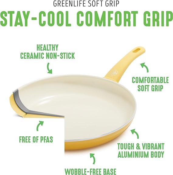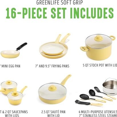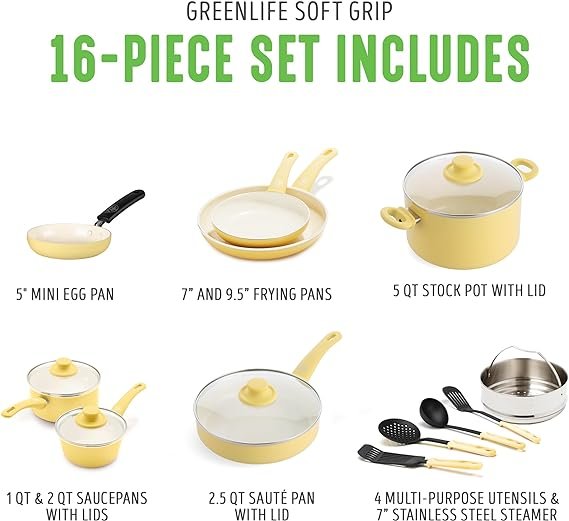 The Soft Grip collection is all about comfort and control. Designed for effortless performance and cleanup, this set features our toxin-free ceramic nonstick coating, which is free of PFAS, PFOA, lead, and cadmium. GreenLife’s healthy ceramic nonstick is not stuck in the past—that’s why our ceramic nonstick starts with sand and creates 60% less CO2 emissions during the curing phase than traditional coatings. The cookware vessels (excluding handles) are made from a minimum of 65% recycled aluminum. Finished in vibrant colors, this set is outfitted with stay-cool handles to keep your cooking comfortable. Durable glass lids for a good look at any meal in progress without sacrificing heat. For all stovetops, except induction. Oven safe to 350°F. Dishwasher safe. This cookware set includes: 4-inch mini frypan, 7-inch and 9.5-inch open frypans, 1-quart and 2-quart covered sauce pans, 5-quart covered stockpot, 2.5-quart covered sauté pan, stainless steel steamer, and 4 kitchen utensils.