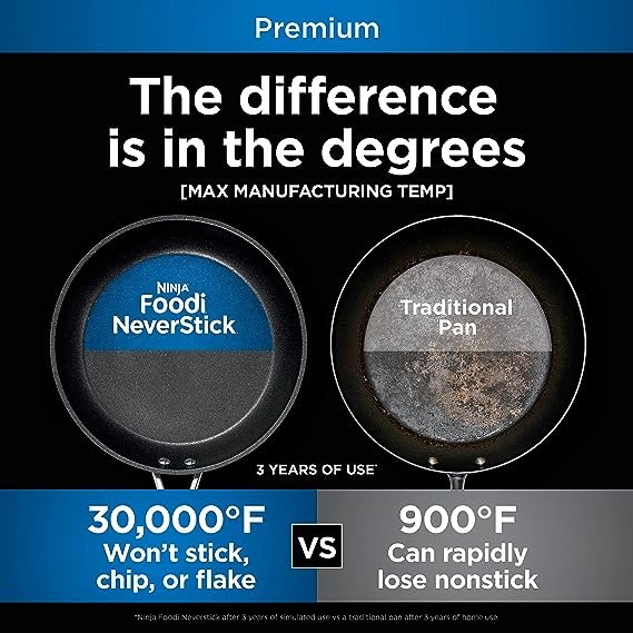 Ninja Foodi NeverStick Premium Cookware is the cookware that won’t stick, chip, or flake. Manufactured at a maximum temperature of 30,000°F, our cookware won’t rapidly lose nonstick like traditional pans made at 900°F. Exclusive NeverStick interior coating heats quickly and evenly to ensure perfect results every time, and the hard-anodized exterior is extremely durable and scratch-resistant. Pans are easy to wipe clean, dishwasher safe and oven safe up to 500°F.