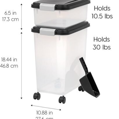 Be the first to review “RIS USA 3-Piece 35 Lbs / 45 Qt WeatherPro Airtight Pet Food Storage Container Combo with Scoop and Treat Box for Dog Cat and Bird Food, Keep Pests Out, Translucent Body, Easy Mobility, Black” Cancel reply