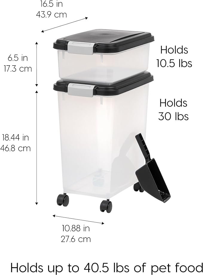 CONTENTS: 10 Lbs / 12 Qt storage container stacks on the 25 Lbs / 33 Qt storage container, one matching 2-cup food scoop, and one set of wheels. Included scoop makes measuring food easy and attachable casters make it easy to roll it around