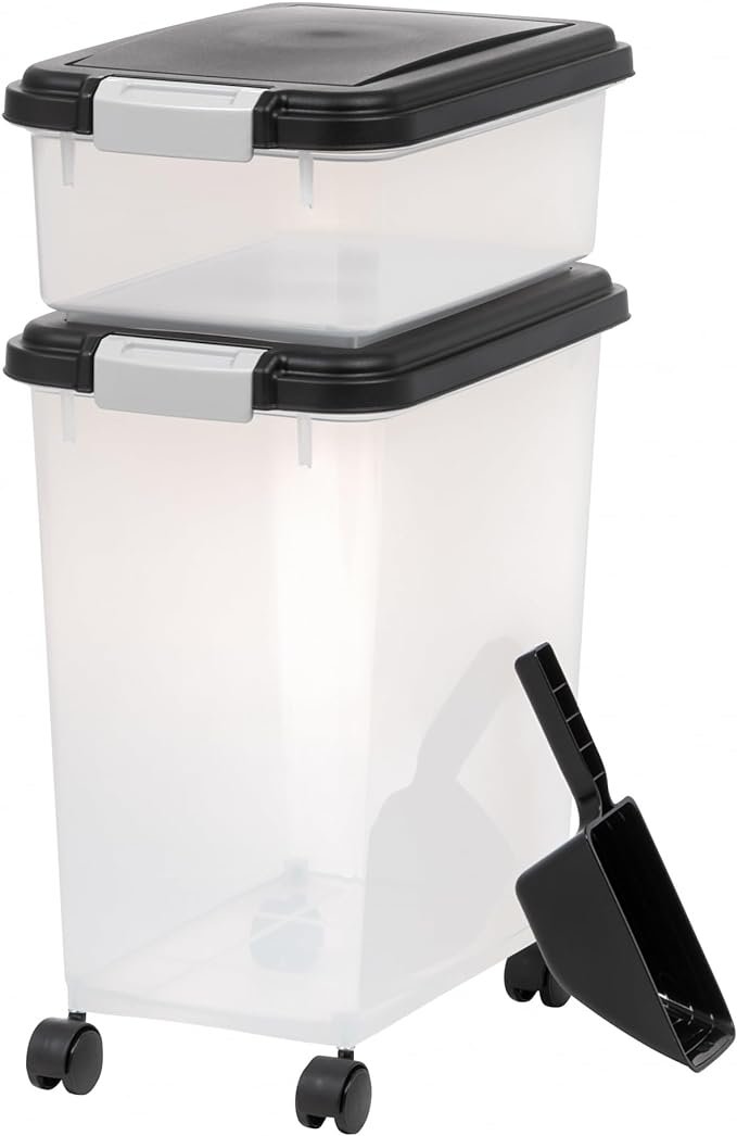 RIS USA 3-Piece 35 Lbs / 45 Qt WeatherPro Airtight Pet Food Storage Container Combo with Scoop and Treat Box for Dog Cat and Bird Food, Keep Pests Out, Translucent Body, Easy Mobility, Black